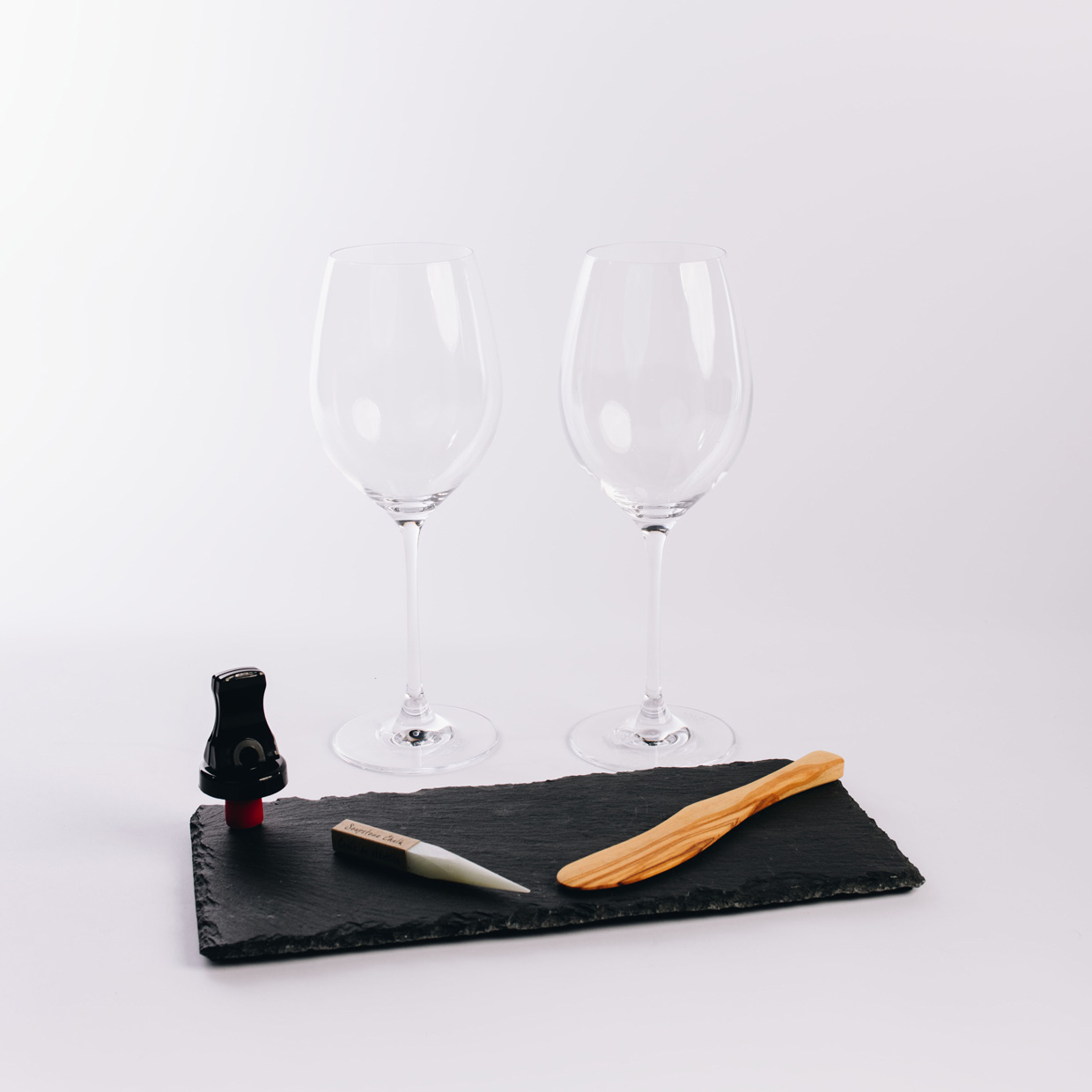 Holiday Cheers&Cheese: Copas de vino tino Tapón para botella de vino Tabla para quesos Tiza para rotular Espátula de madera.