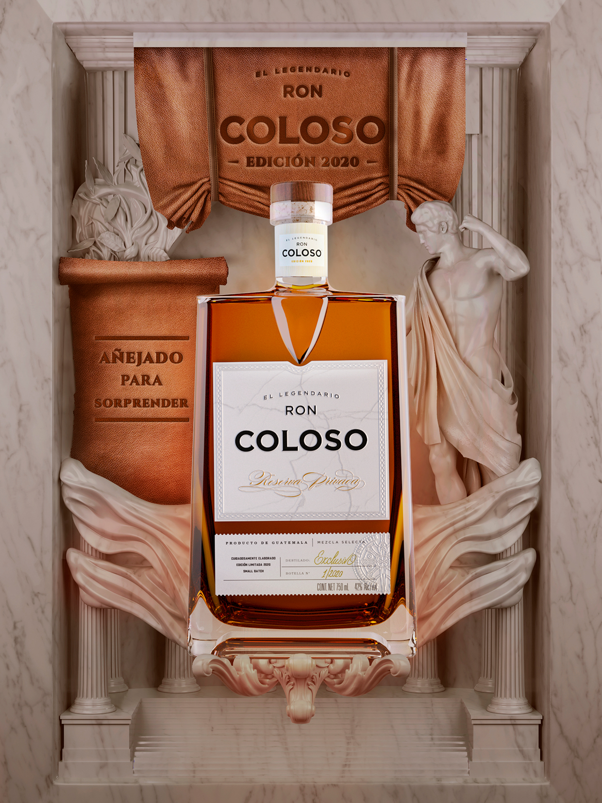 Ron Coloso es un regalo único y exclusivo que Licores de Guatemala ofrece a sus consumidores cada 10 años como expresión de un ron categorizado como una joya para el paladar.  El diseño colosal, masculino y elegante de la botella, tiene detalles en mármol, que hacen referencia a las estatuas que están hechas con este material y que reflejan la grandeza de este licor.