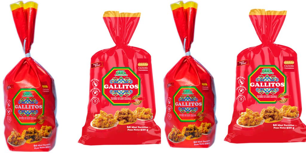 Gallitos llega en un práctico y colorido empaque con cierre seguro, asegurando que cada bocado conserve su frescura y autenticidad. Disponible en una presentación de 60 unidades (520 g), con mini-tortillas de maíz en colores blanco y amarillo.