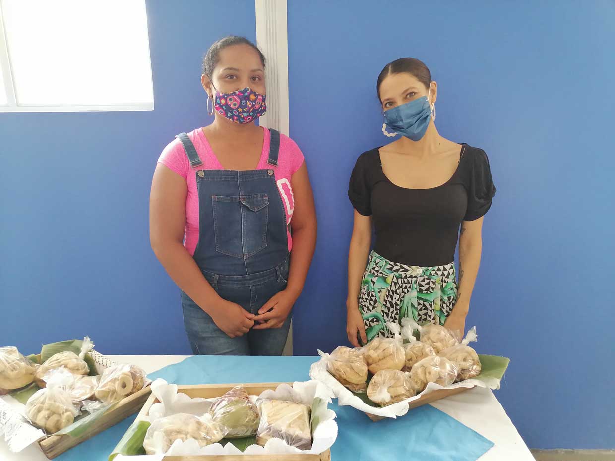 Debi Nova con Elen Villegas, quien ofrece repostería típica de la zona 100% de maíz.