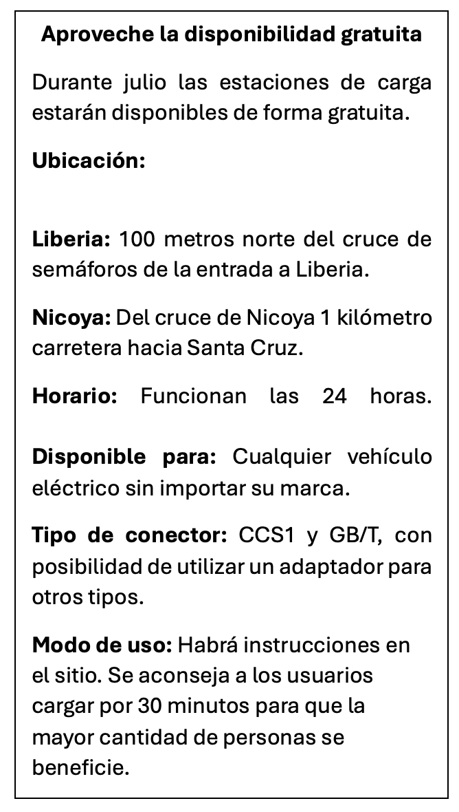 La empresa cuenta con cuatro espacios de carga rápida funcionando las 24 horas en sus sucursales de Liberia y Nicoya.