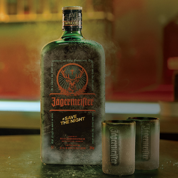 El exclusivo diseño de la botella cuenta la historia de #SAVETHENIGHT. La Edición Limitada -que aparece completamente oscura- visualiza el cierre de la vida nocturna en todo el mundo. Dado que Jägermeister se sirve mejor helado, la magia se produce en cuanto el líquido alcanza su temperatura perfecta de consumo de -18 grados dentro del congelador: El diseño de la parte delantera -con el logotipo #SAVETHENIGHT impreso en dorado- empieza a cambiar y aparece el color. Los elementos centrales de Jägermeister impresos directamente en la botella aparecen y devuelven literalmente la vida a la vida nocturna.