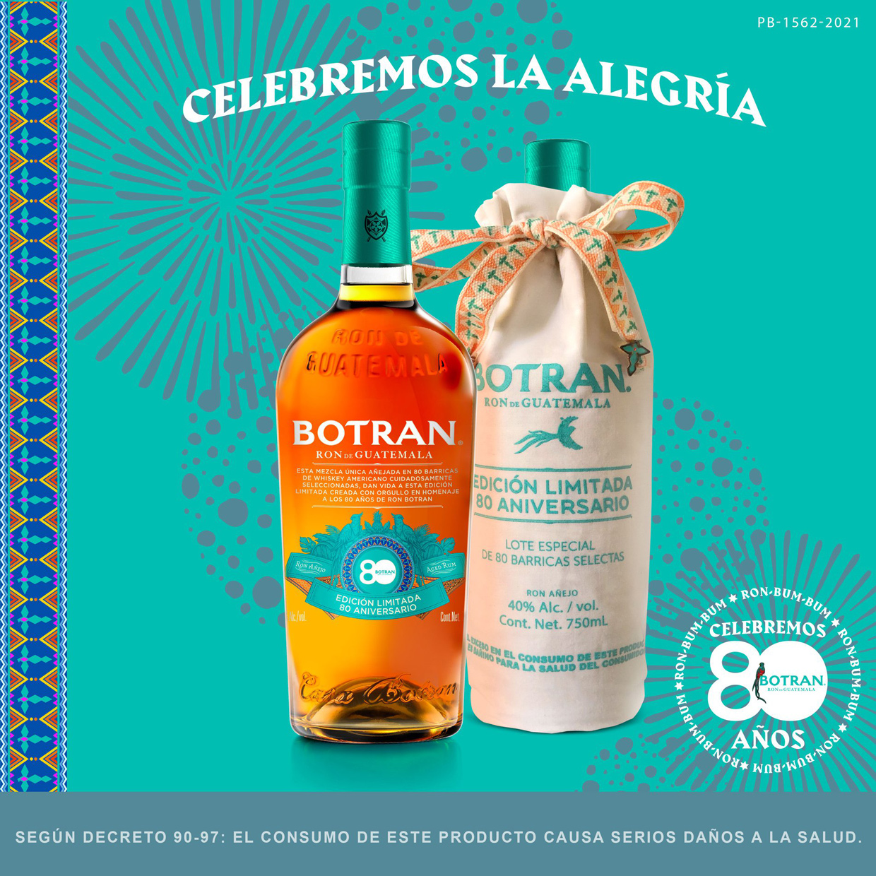 Botran 80 Aniversario es un ron originario de Guatemala, su grado alcohólico es de 40% y las botellas que se estarán distribuyendo al público tendrán capacidad de 750 ml, y estarán acompañadas de una bolsa conmemorativa.
