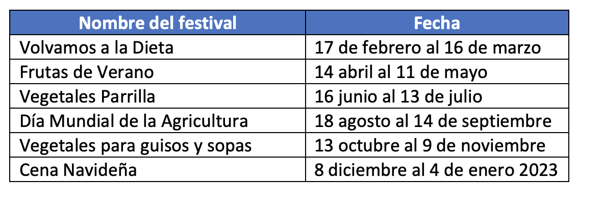 En aras de contribuir al consumo de productos agrícolas locales y dar a conocer el Programa Tierra Fértil, Walmart de México y Centroamérica estará desarrollando durante todo el año un total de seis festivales de frutas, verduras y vegetales, iniciando con el primer evento dedicado a retomar un estilo de vida saludable. En todas las tiendas Walmart de la región, además de los supermercados Masxmenos (Costa Rica) y Paiz (Guatemala), los clientes podrán visitar stands especiales con una mayor exposición de los productos agrícolas de cada temporada.