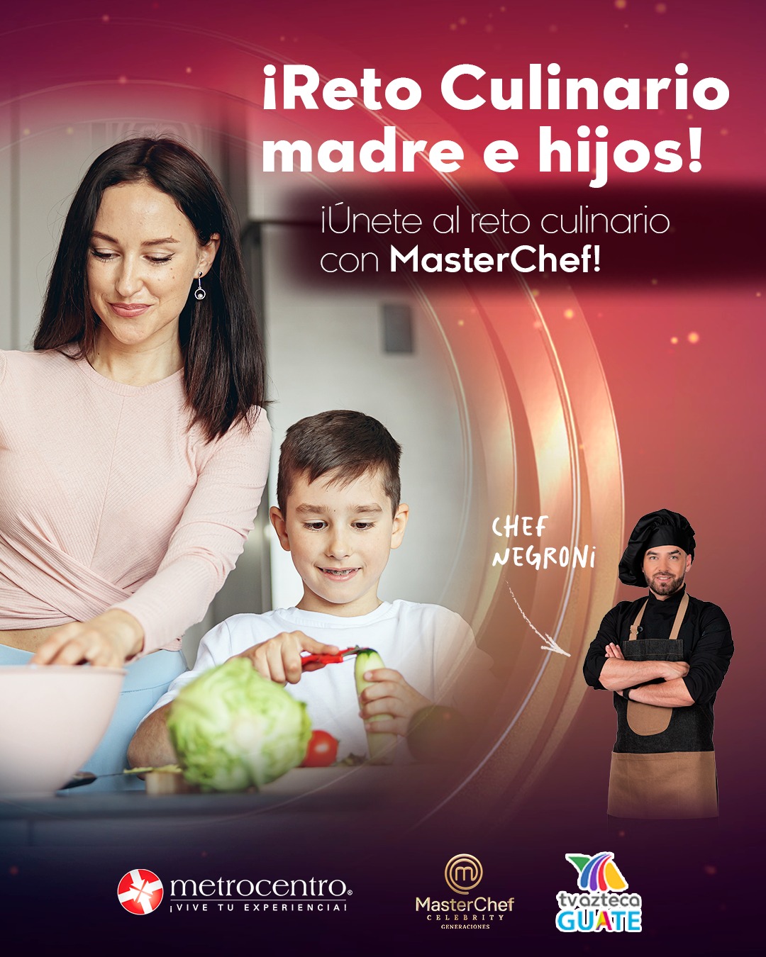 Inspirado en los programas de cocina más reconocidos de la televisión, como MasterChef, el Reto Culinario realizará el sábado 31 de mayo a partir de las 9 a.m. en Metrocentro. Será una experiencia llena de sabor y emoción, donde madres e hijos trabajarán en equipo para crear un platillo especial utilizando un kit de ingredientes sorpresa que se les entregará al inicio del reto. El encargado de evaluar cada creación será el reconocido Chef Negroni, quien aportará su experiencia y carisma como juez del evento.
