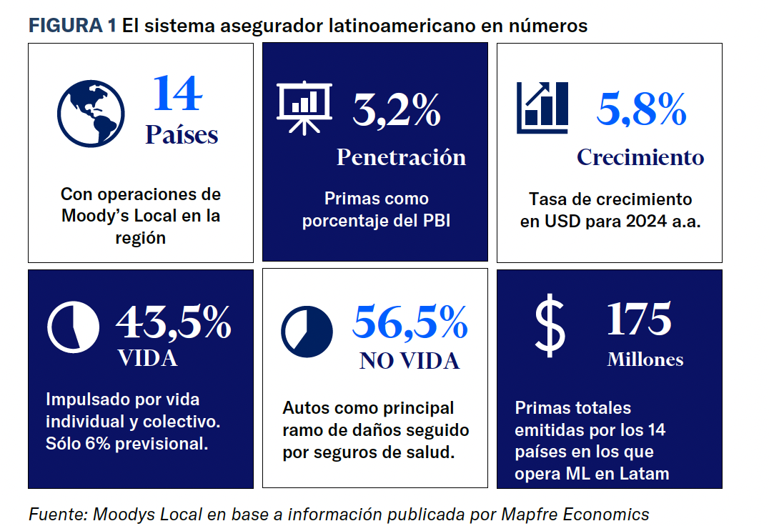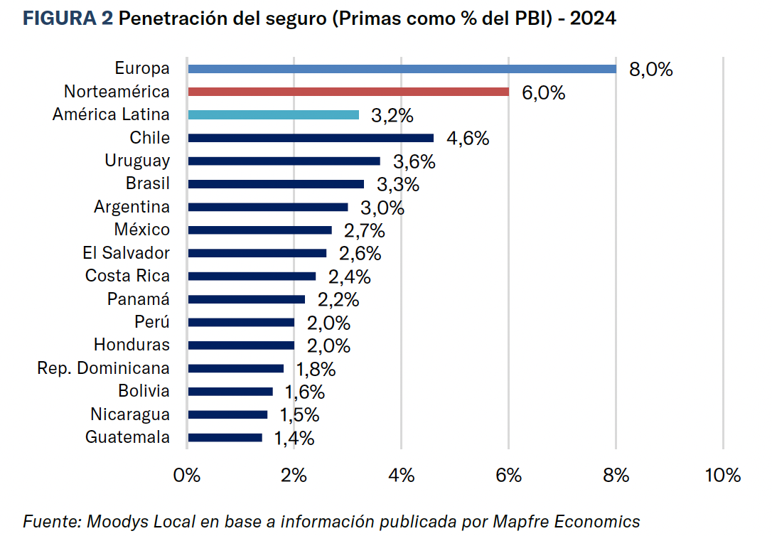 En su análisis, Moody’s Local destaca que la penetración del seguro en Latinoamérica promedia el 3% del PBI, por debajo de mercados desarrollados, pero tiene potencial de crecimiento.