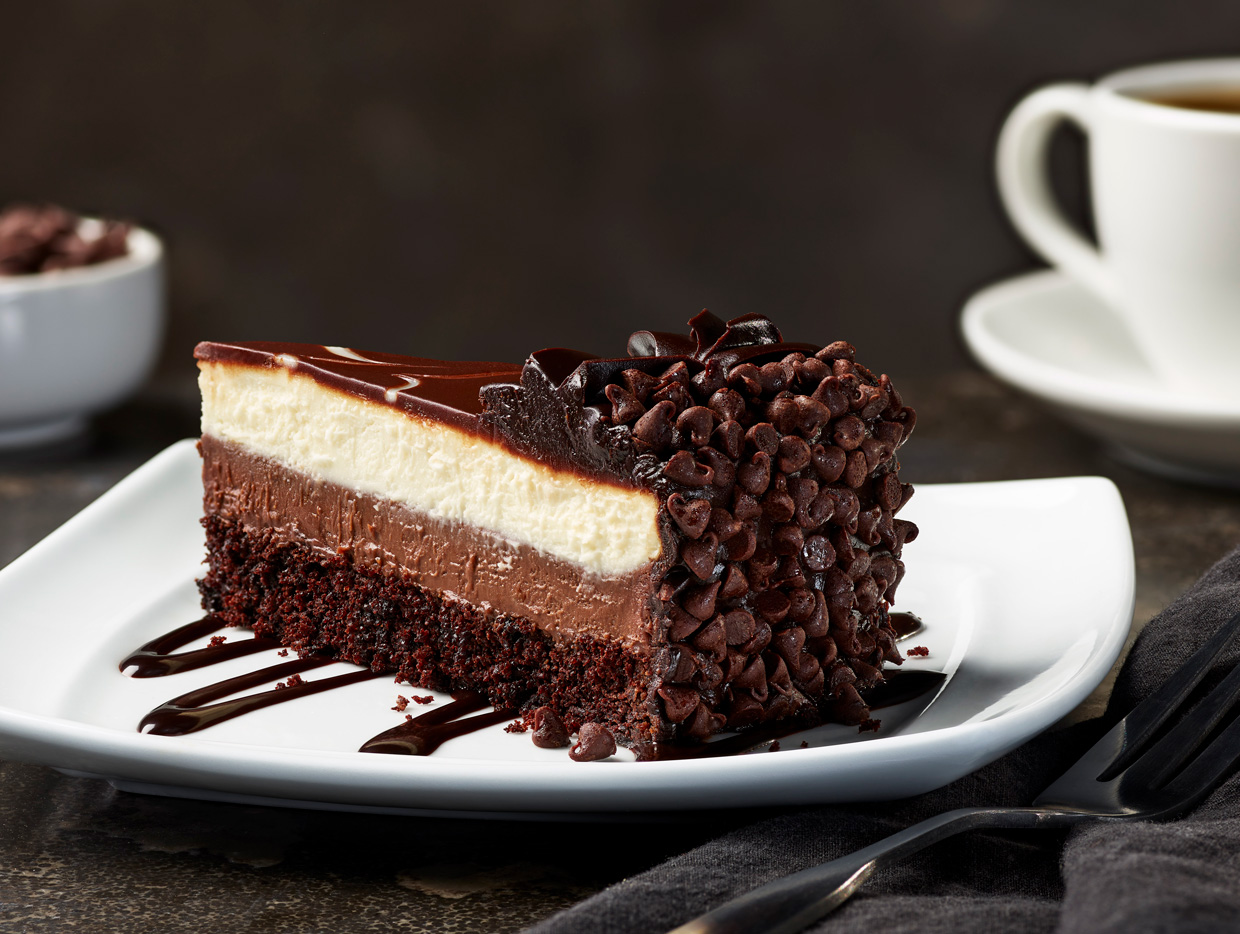 El Black Tie Mousse Cake es una torta de chocolate, cheesecake de chocolate oscuro y crema con glaseado.