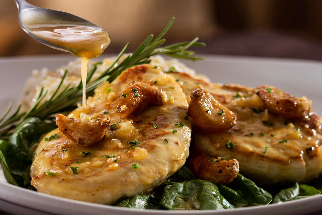 Por otro lado, llega el Garlic Rosemary Chicken: pechugas de pollo asadas cubiertas con dientes de ajo caramelizados y romero, servido con fettuccine alfredo.