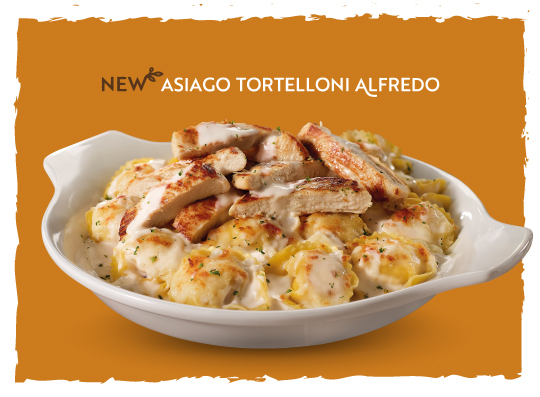 Otro platillo que integra este menú es Asiago Tortelloni Alfredo, compuesto por Tortellonis rellenos con queso Asiago, horneados con salsa Alfredo hecha en casa y cubiertos con una mezcla de quesos italianos. También puede acompañarse con ensalada o sopa y breadsticks ilimitados.