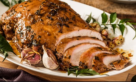 Como platos fuertes se puede seleccionar el pernil de cerdo horneado, en sus jugos y con salsa de reducción de vino, se calcula unos 200g por persona a 15.000 el kilo, o el lomo de cerdo lentamente horneado relleno de pistacho y cebollitas caramelizada con reducción de vino marsala, 18.000 el kilo, mínimo 2.5 kilos.