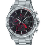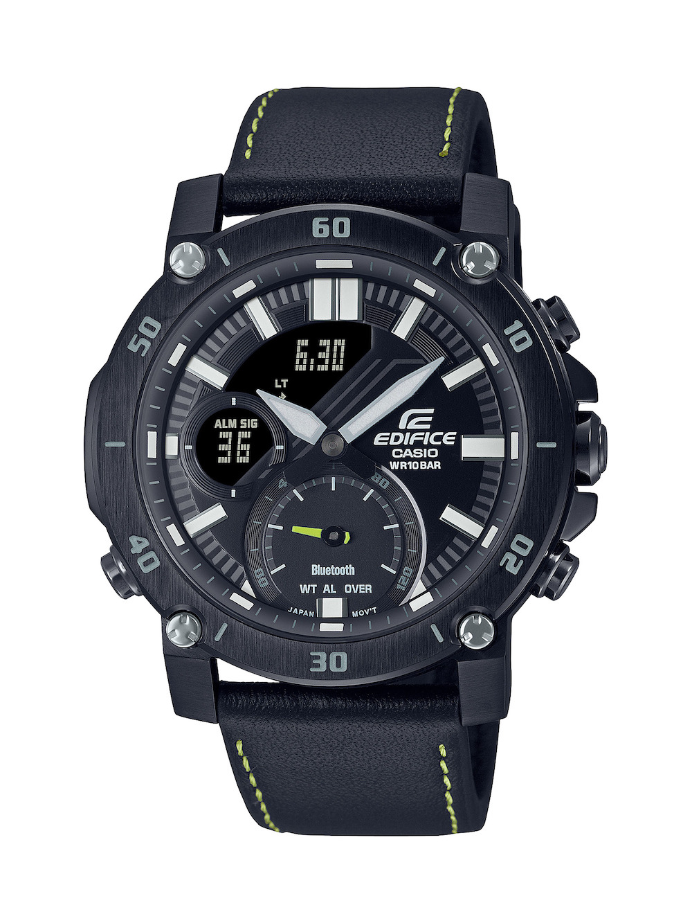 Pulsera de eslabones y estilo clásico. Para quienes prefieren relojes de acero con eslabones, perfectos para usar en el día a día u ocasiones especiales, el EQB-1000XD-1A de EDIFICE es una excelente elección. Con un marco con taquímetro y detalles en rojo que le dan un aspecto fresco y alusivo al mundo del automovilismo, este modelo también cuenta con interesantes funciones tecnológicas. Además de su vinculación con smartphones vía Bluetooth®, tiene un sistema de alimentación Tough Solar (carga solar) que permite la carga incluso por exposición a luz fluorescente, todo incluido en una carcasa de tan solo 8,9 mm de espesor que resiste el agua hasta a 100