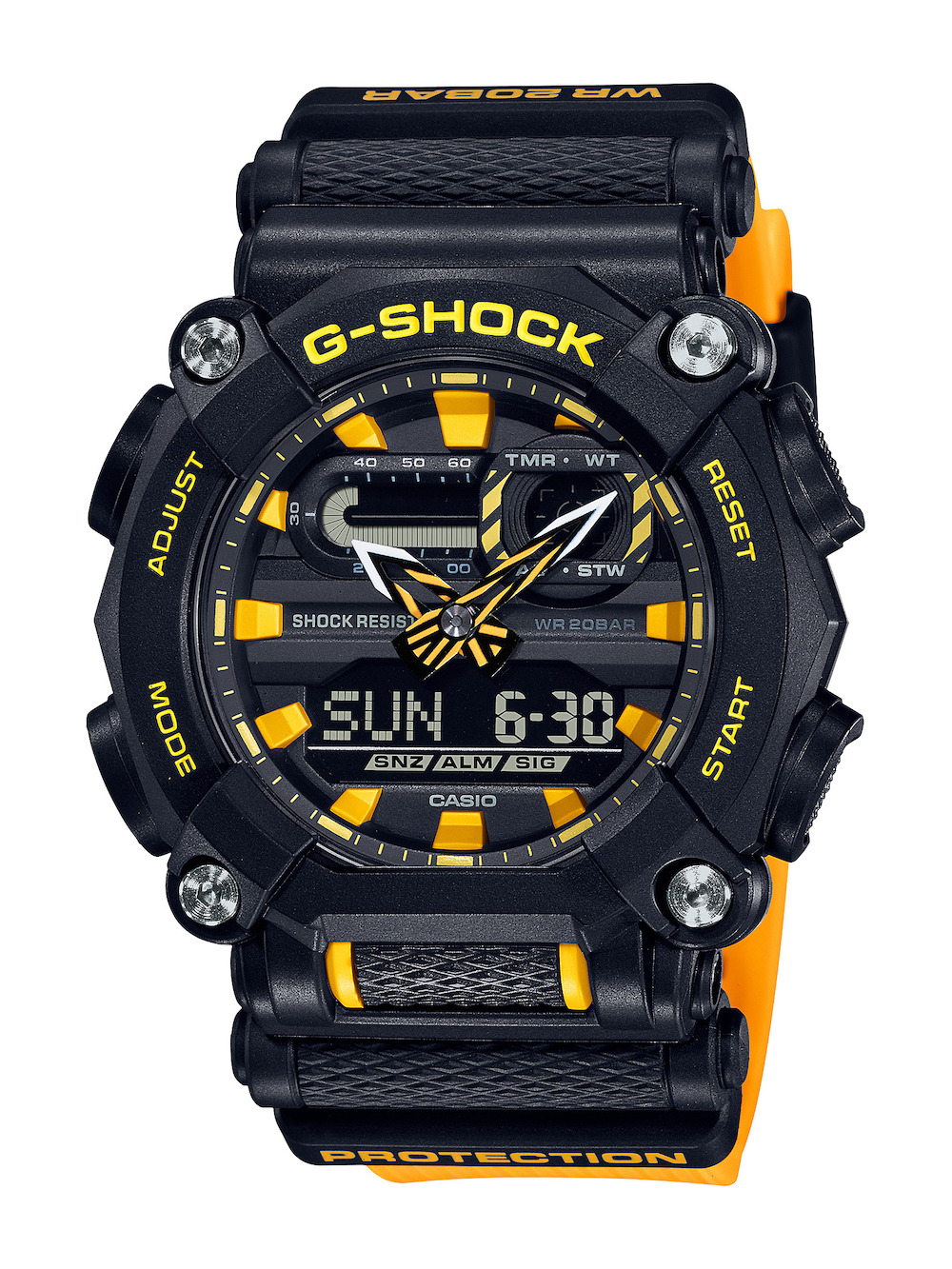 Diseño robusto y urbano. Si su papá aprecia el estilo urbano y moderno, el GA-900A-1A9 de G-SHOCK es una excelente opción. Su diseño de inspiración industrial se crea con un marco de 10 lados que se asemeja a la forma de unatuerca, así como con sus llamativos colores amarillo y negro. El marco fijado mediante cuatro tornillos le da una apariencia resistente y robusta, mientras que su correa está diseñada para ajustarse de manera cómoda sin deslizarse. Este reloj esresistente a impactos y al agua hasta a 200 metros de profundidad, perfecto para acompañarle en cualquier tipo de actividado
