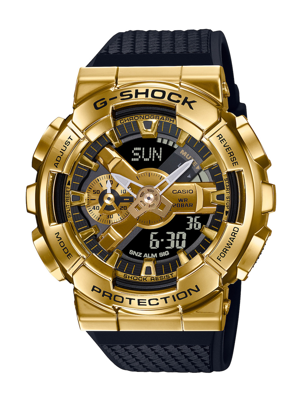 Estilo metálico fashionista. Sorprenda a su papá con un reloj que le de fuerza a sus looks más trendy. El GM-110G-1A9, modelo analógico-digital de la colección Metal Covered, tiene un marco de acero inoxidable con un deslumbrante color dorado que se ha forjado, cortado y pulido para que obtenga su diseño Este reloj tiene la característica resistencia a impactos, resistencia magnética y al agua hasta a 200 metros que ofrece G-SHOCK en sus piezas.