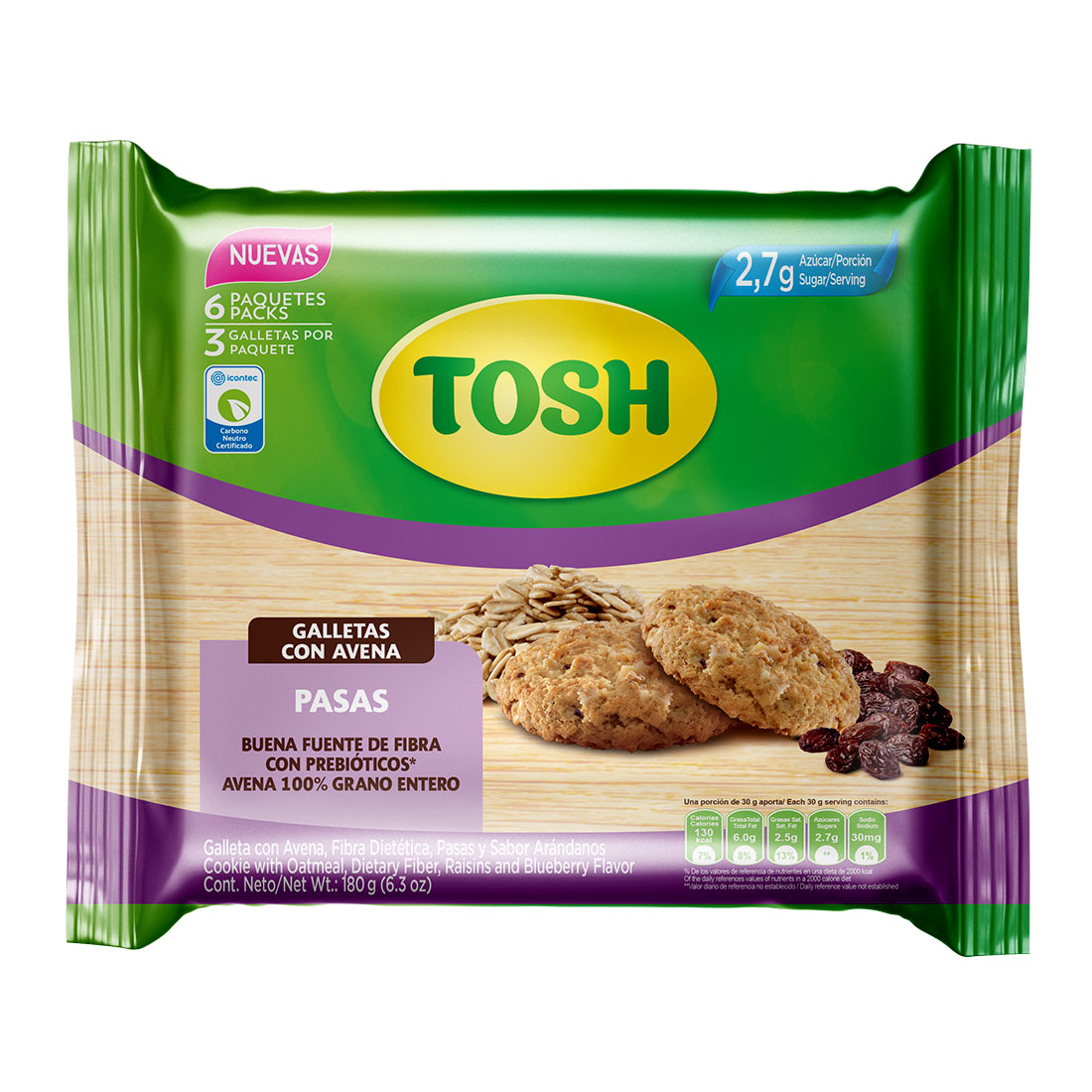 Las nuevas galletas Tosh con avena, pasas y sabor arándanos completa la familia de galletas Tosh con avena, que ya cuenta entre sus integrantes con las variedades sabor ajonjolí y miel, así como las galletas Tosh con avena sabor chocolate y cocoa.