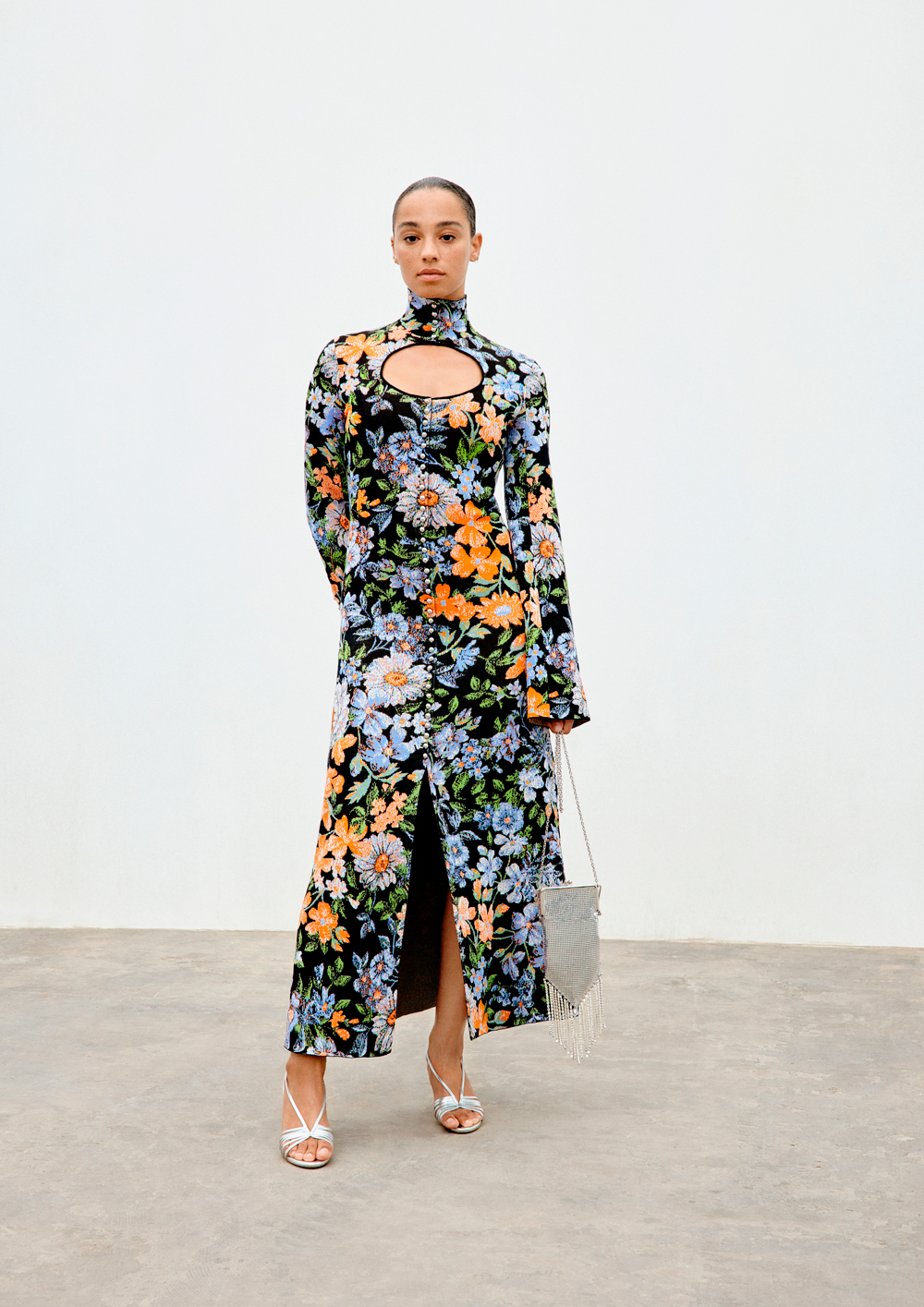 Las piezas clave para las mujeres incluyen vestidos de malla metálica y lentejuelas espejadas, junto con piezas adornadas con pedrería y estampado de leopardo. Para los hombres, los elegantes suits plateados y los chalecos de malla metálica llaman la atención junto con la lujosa ropa de loungewear. En cuanto a los accesorios, las versiones contemporáneas de las icónicas lentejuelas y los bolsos de malla metálica de Rabanne, se roban el protagonismo.