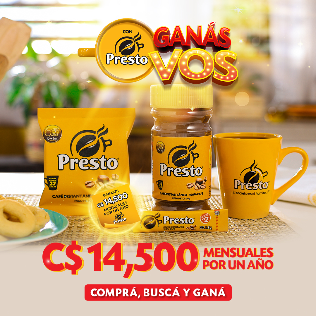 Café Presto, en búsqueda de premiar la fidelidad de sus consumidores, lanza por segundo año consecutivo la mega promo “Con Presto Ganás Vos” trayendo más de 400 premios a las familias en Nicaragua, representando un monto de +2.000.000 de córdobas.