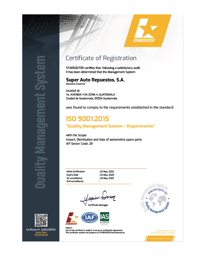 Con la finalidad de mantener y perfeccionar los niveles de homogeneidad en relación con la gestión, desarrollo y prestación de servicios en el ramo de comercio automotriz aftermarket, Repuestos Acquaroni recibió recientemente el certificado de la empresa Staregister, la cual, tras una exhaustiva auditoría, determinó que el sistema de gestión sigue cumpliendo con los requisitos establecidos en la norma ISO 9001: 2015.