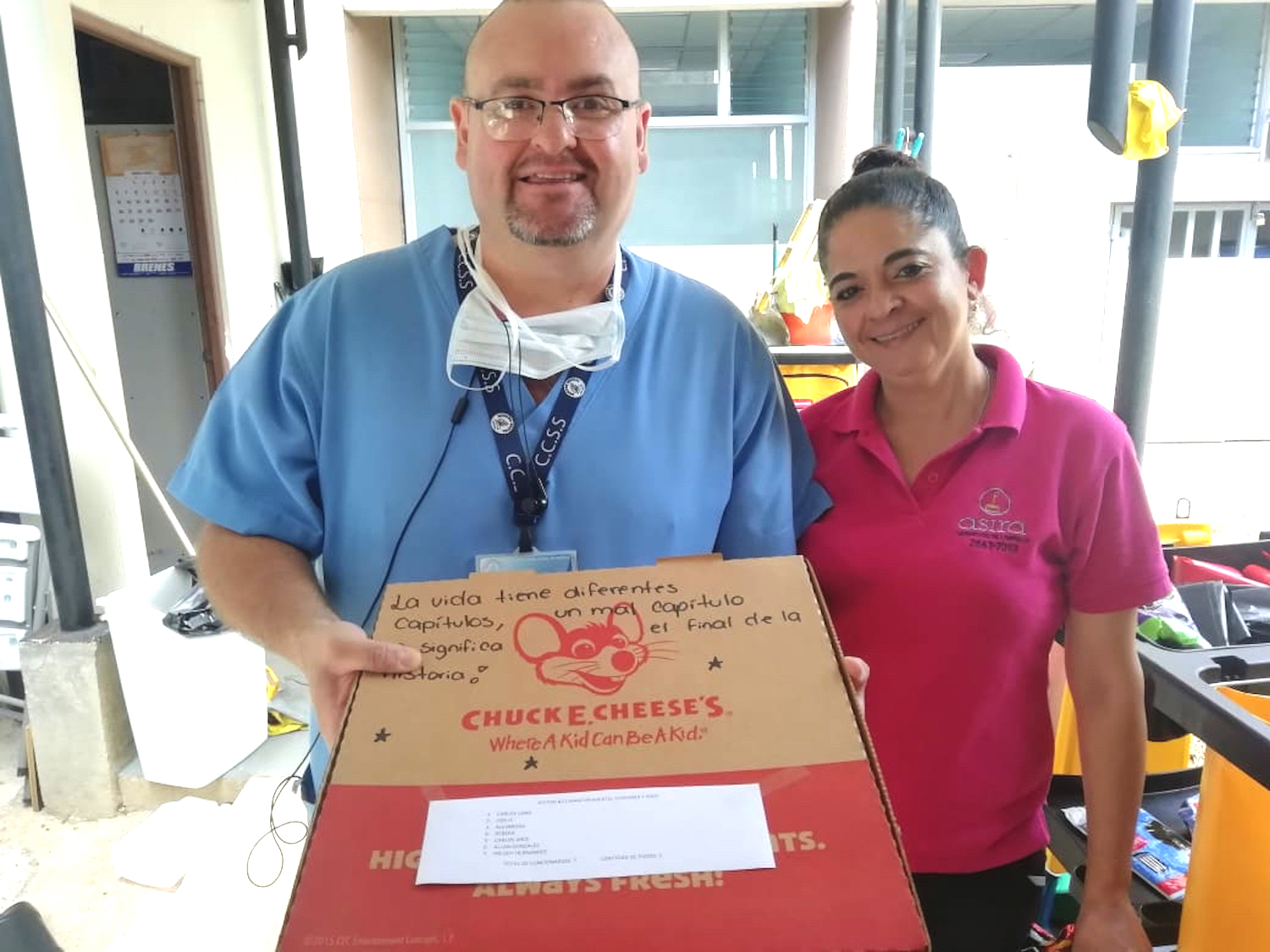 De acuerdo con Adriana Álvarez, propietaria de Chuck E Cheese, todas las cajas iban con diferentes mensajitos de apoyo y agradecimiento. En un momento de mucho estrés para los funcionarios de estos centros médicos, y un mensaje de “estamos con ustedes” no está de más en medio de esta emergencia. Y ChuckE les llevó un ratito diferente al escenario de todos los días.