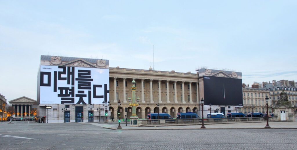 Los carteles publicitarios, que se han instalado en la famosa Place de la Concorde de París, combinan hermosas imágenes con texto escrito en Hangul, el alfabeto coreano. La traducción de los mensajes intrigantes es: «El futuro se despliega» y «20 de febrero».