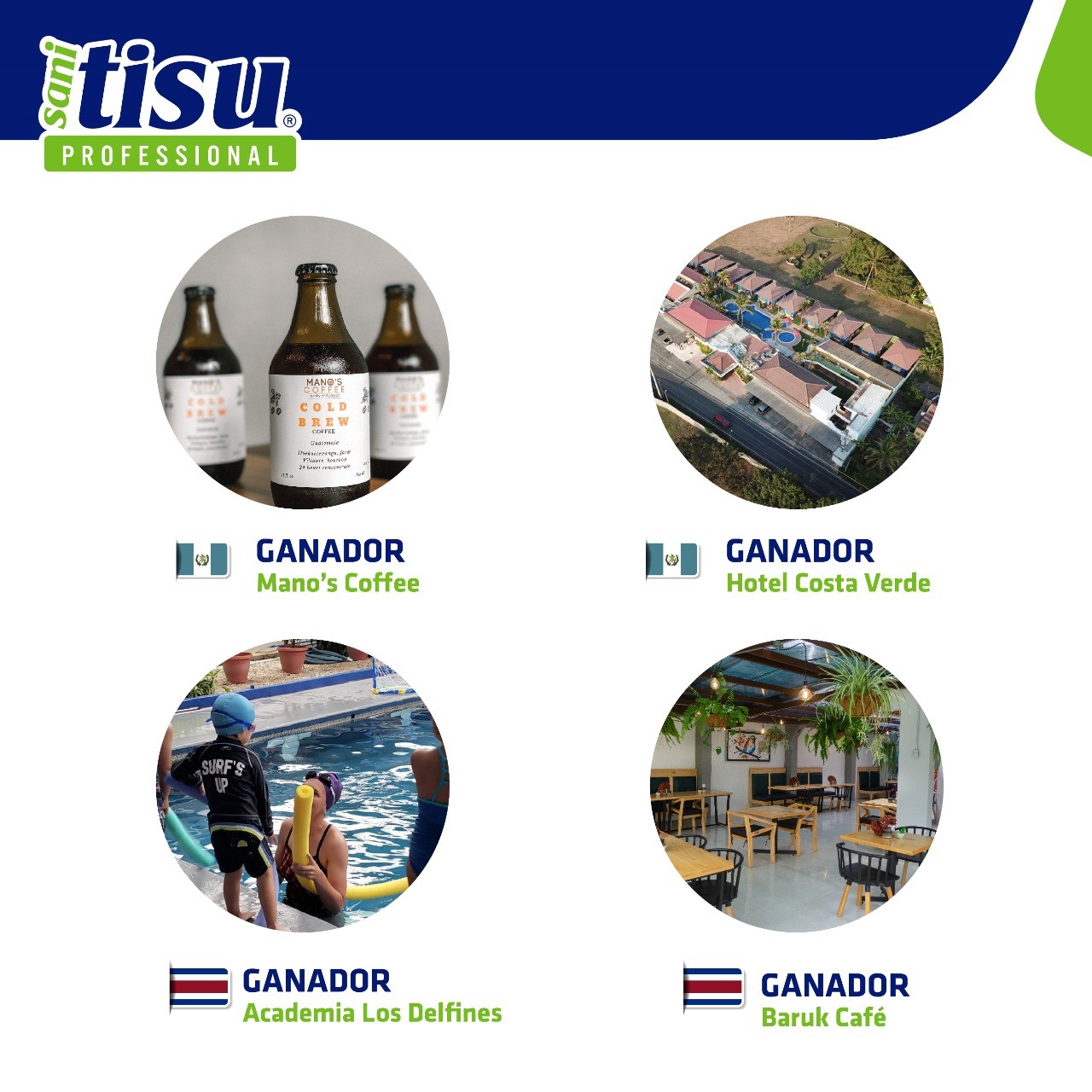 Tras días de evaluación y validación de métricas, se eligieron dos ganadores del Reto Pymes de Sanitisu Professional por país. Los ganadores son: Mano´s Coffee, quien se destacó por su innovación en su servicio, Hotel Costa Verde quien se destacó por estabilidad en su modelo de negocio; y de Costa Rica los ganadores son Baruk Café & Bistro quien se destacó por su potencial de crecimiento e innovación y Academia de Natación Los Delfines, quien se destacó por modelo de negocio y su potencial de crecimiento a otros mercados.