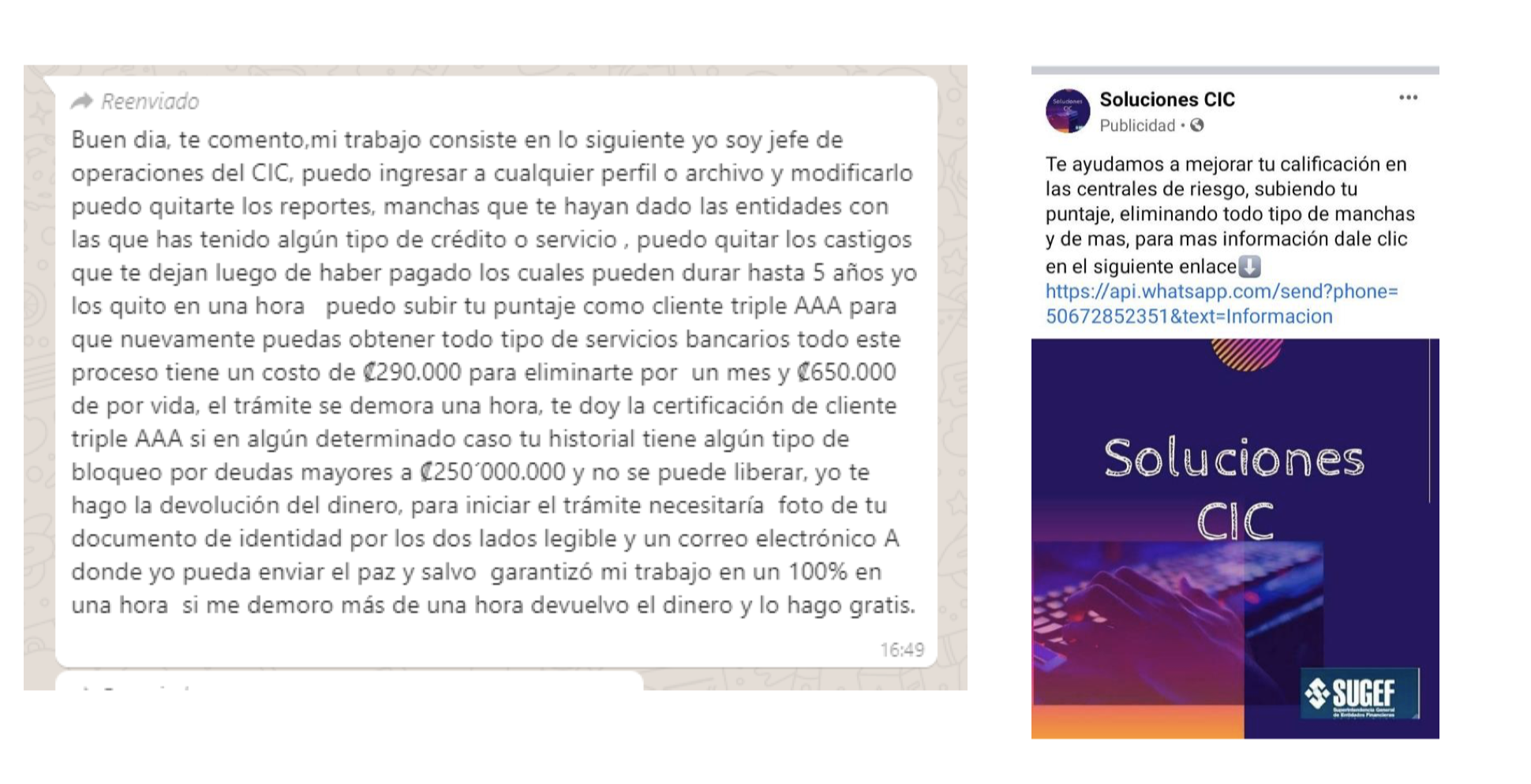 Los estafadores utilizan los diversos canales digitales: llamadas telefónicas, suplantación de correo electrónico, WhatsApp, páginas web falsas, así como redes sociales (especialmente Facebook) y les ofrecen a las personas, en el caso de la SUGEF, borrar en una hora su historial crediticio a cambio del pago de 290.000 colones por el plazo de un mes, o bien 650 000 colones para realizar el proceso “de por vida”. La persona que ofrece estos servicios se hace pasar por jefe del CIC e indica que puede borrar cualquier mancha o reporte que hayan realizado las entidades financieras, así como subir la clasificación a cliente AAA.
