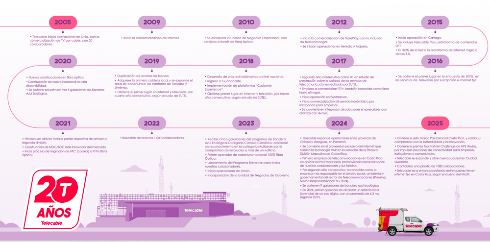 Hace dos décadas, Telecable nació con un propósito: llevar tecnología a todos los rincones de Costa Rica. Hoy, ese propósito ha evolucionado hacia la innovación constante de la experiencia de sus clientes, conectándolos a nuevas oportunidades que impulsan el desarrollo digital y fortalecen la competitividad nacional.