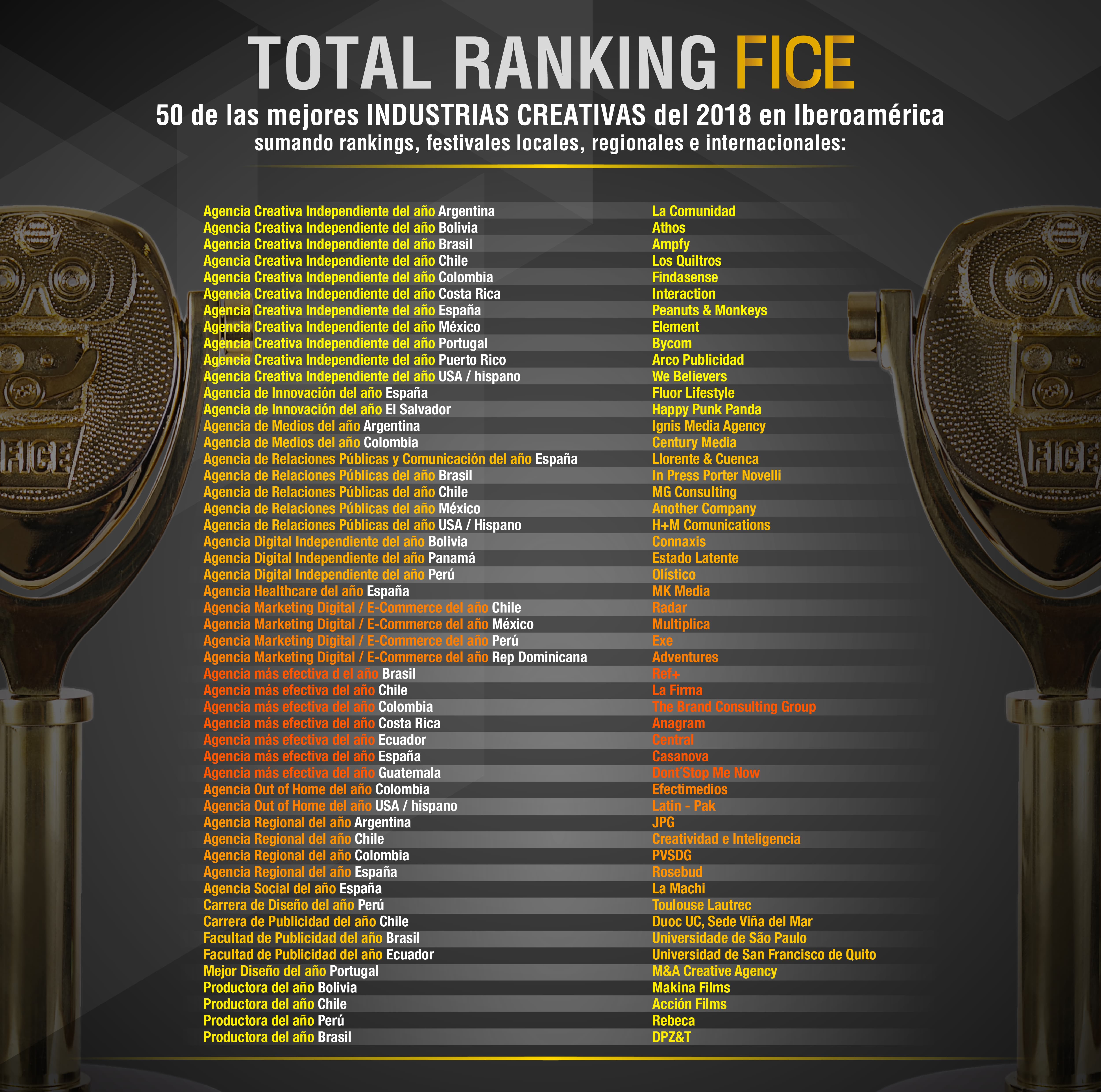 Fice en su edición especial del 2018, dio a conocer el Total Ranking: el termómetro que servirá para conocer cuáles son las agencias y redes multinacionales independientes más protagónicas de la región en el año. Esta medición tuvo en cuenta la figuración de las agencias en los principales festivales locales, regionales e internacionales.