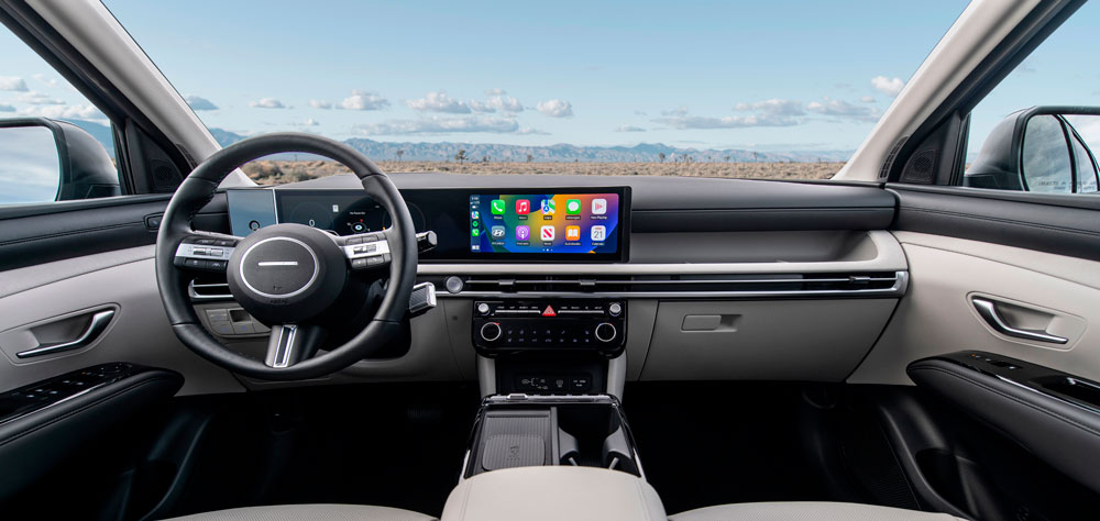 El nuevo Tucson presenta una rejilla frontal más amplia, luces traseras LED y una presencia robusta y moderna. Su interior ha sido rediseñado para ofrecer mayor confort y tecnología, destacando una consola central simplificada y un panel de instrumentos digital de 12.3 pulgadas.