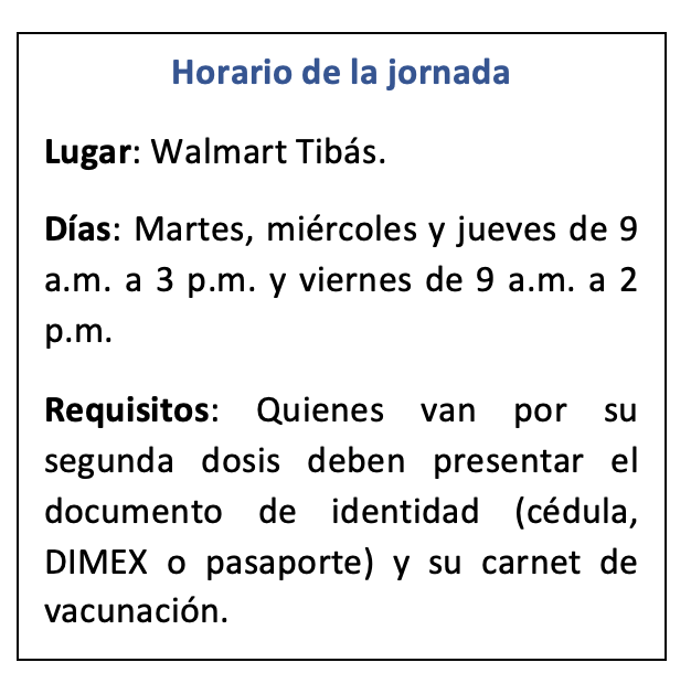 Menores de 10 años en adelante, así como adolescentes y adultos que requieran iniciar o completar sus esquemas de vacunación contra el COVID-19, pueden acercarse a Walmart Tibás, en Costa Rica, esta semana.
