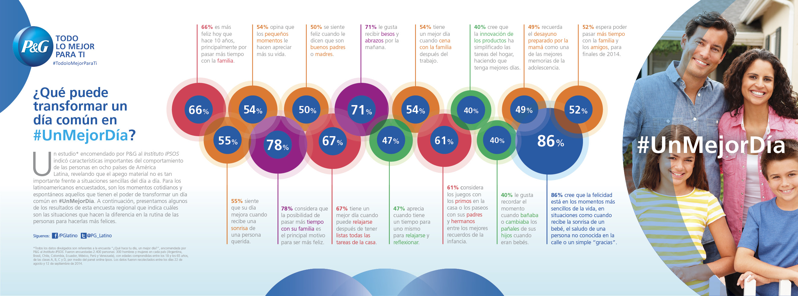 Para conocer ‘¿Qué hace tu día, un mejor día?’, Procter & Gamble lideró a través del Instituto IPSOS un estudio aplicado a 2.400 personas en ocho países de América Latina. Esta encuesta reveló que un 66% de las personas opinan que hoy son más felices que hace 10 años; además, más de la mitad de los encuestados piensan que son los pequeños momentos los que le hacen apreciar más su vida.Infografico_Selene_Latam_v3