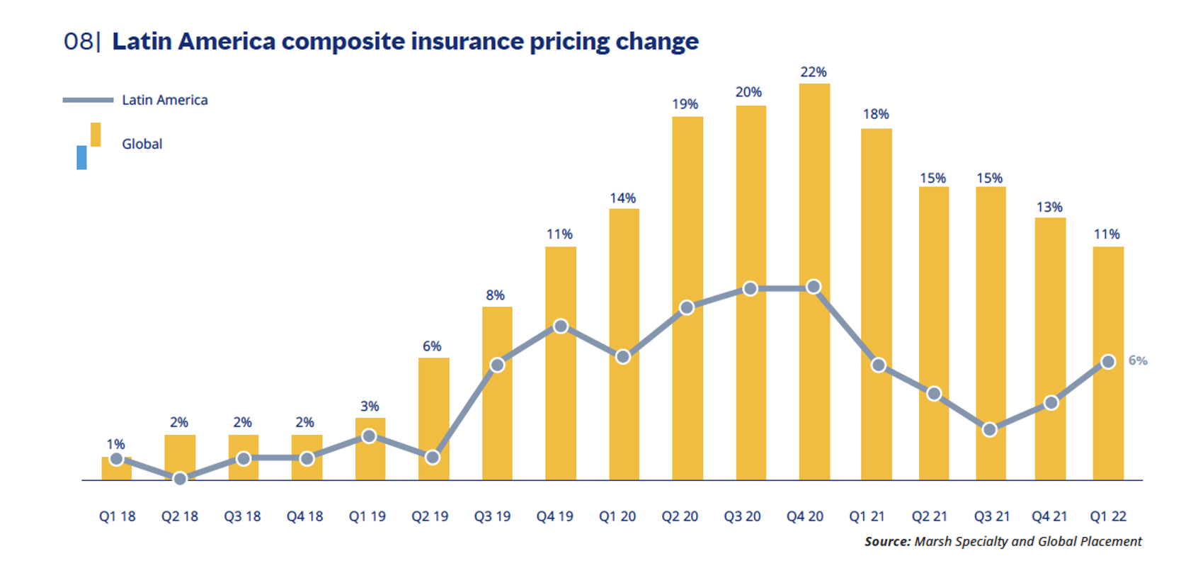 Por el contrario, en Latinoamérica sí se observaron incrementos de precios con respecto al trimestre anterior: 6% contra un 4% en el útlimo trimestre de 2021. Los precios de riesgos de responsabilidad civil en la región se mantuvieron estables, lo que marca un cambio en la tendencia mostrada en trimestres anteriores.