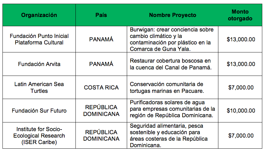 Un total de US$50,000 fueron entregados a cinco organizaciones sin fines de lucro en Panamá, Costa Rica y República Dominicana para continuar sus esfuerzos de educación, rescate y preservación ambiental. Este año, los proyectos elegidos abarcan asuntos tales como la restauración del área boscosa en el Canal de Panamá, la educación ambiental a través del arte y la literatura, la conservación de tortugas marinas, el desarrollo de purificadores solares de agua y la seguridad alimentaria para áreas costeras.