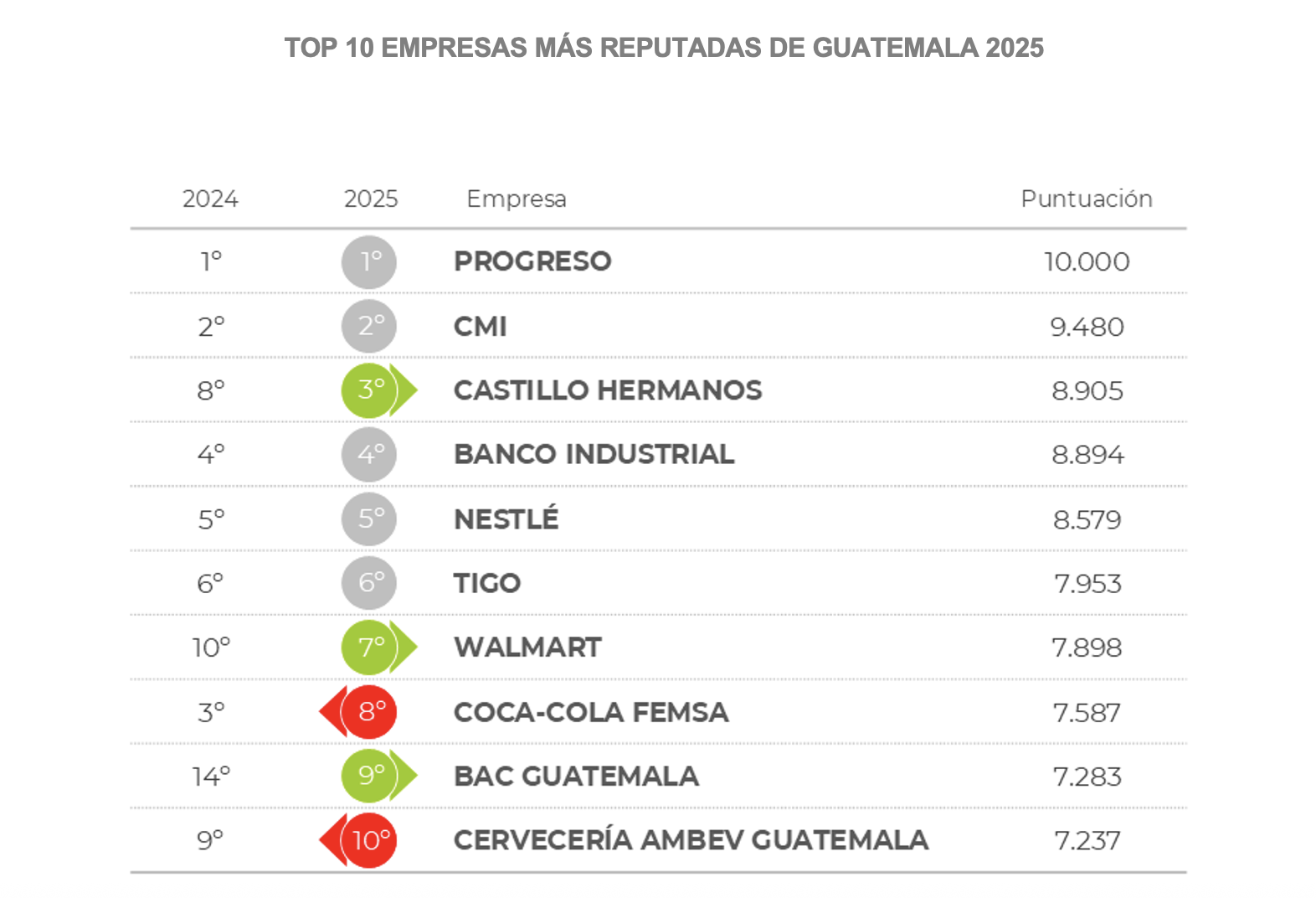 En esta ocasión, Progreso (1º), CMI (2º) y Castillo Hermanos (3º) son las tres empresas que lideran el ranking, mientras que Banco Industrial (4º), Nestlé (5º), Tigo (6º), Walmart (7º), Coca-Cola Femsa (8º), Bac Guatemala (9º) y Cervecería Ambev Guatemala (10º) completan los diez primeros puestos del ranking general.