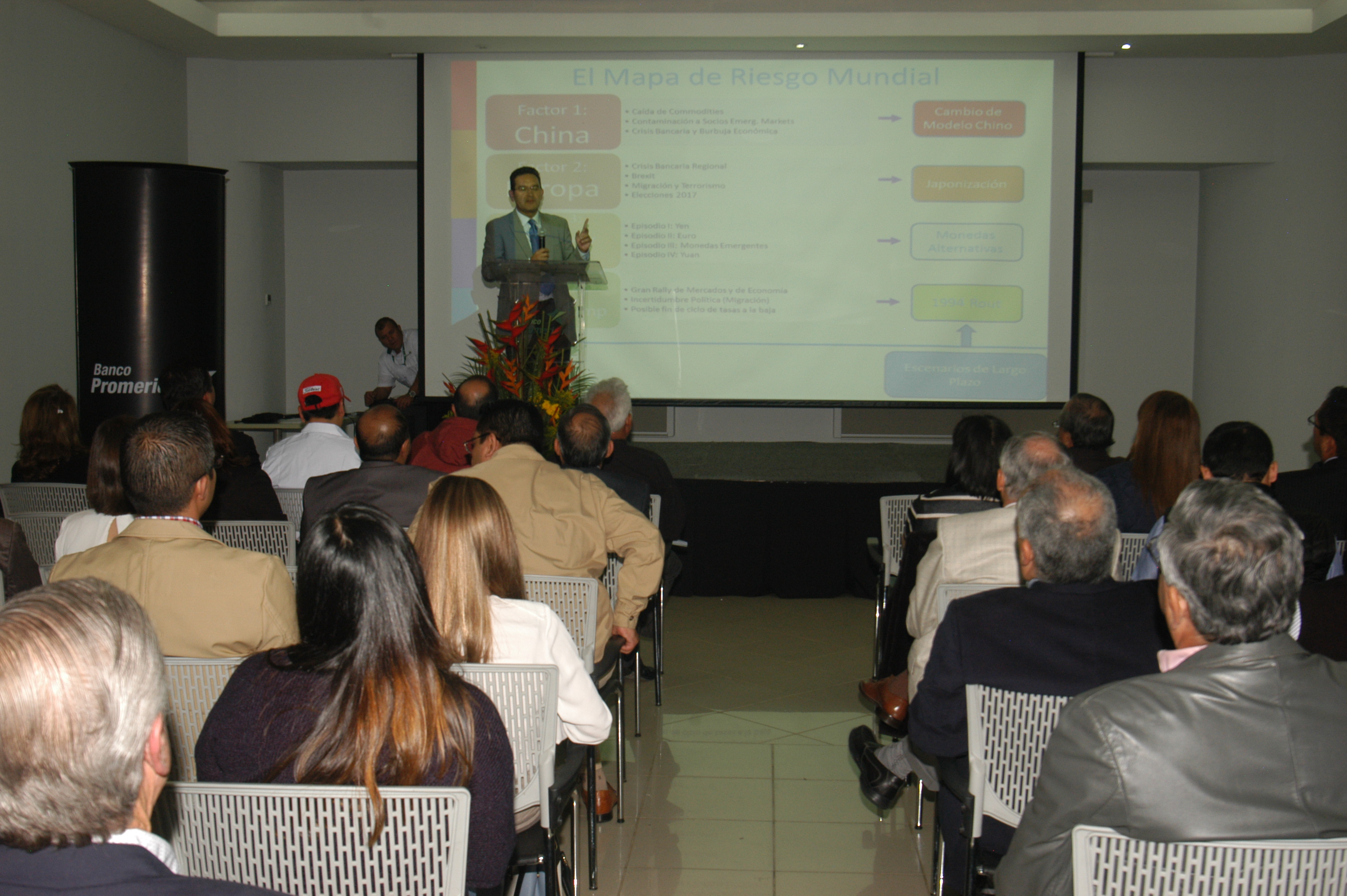 El conferencista internacional Paulo de León, con amplia experiencia en mercado financieros y modelos cuantitativos, expuso un tema de valor para los clientes de Promerica, presentando un mapa de riesgo mundial que considera 4 importantes factores de riesgo para el desarrollo de la economía global.