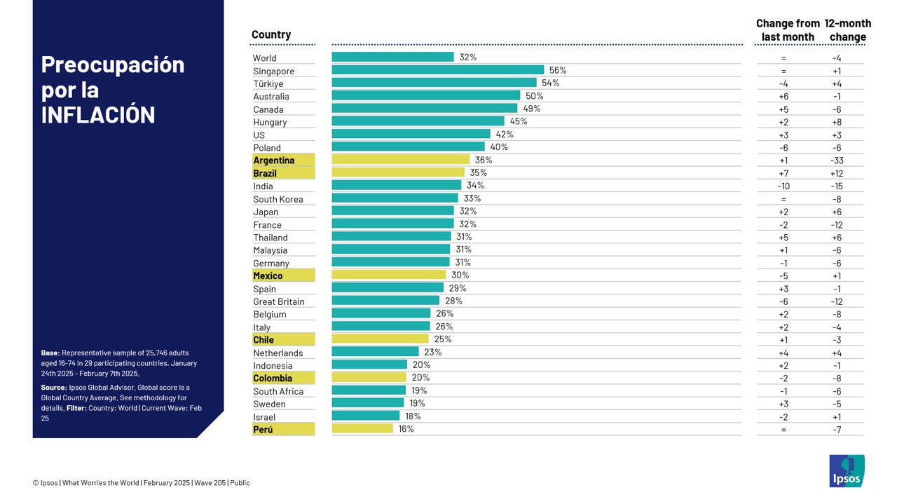 La más reciente edición del estudio global What Worries the World, desarrollado por Ipsos, líder en investigación de mercado, analiza las principales preocupaciones sociales y políticas a nivel mundial. El informe destaca que la inflación continúa siendo la mayor inquietud global, aunque por un margen reducido. Si bien históricamente la inflación ha sido un tema crítico en América Latina, la gestión económica en distintos países de la región ha permitido que su impacto disminuya y actualmente no figure entre las principales preocupaciones. En contraste, el estudio señala que la inflación genera hoy mayor preocupación en Estados Unidos y Canadá que en países como Argentina o México.