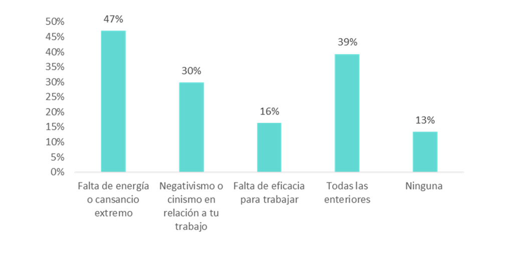 Un 47% de los trabajadores afirma sentir falta de energía o cansancio extremo; mientras que el 30% experimenta negativismo o cinismo en relación al trabajo. El 16% advierte una disminución en su eficacia para trabajar, el 39% experimentó todas las sensaciones juntas antes mencionadas. Y solo un 13% no padece ninguno de los síntomas de burnout.