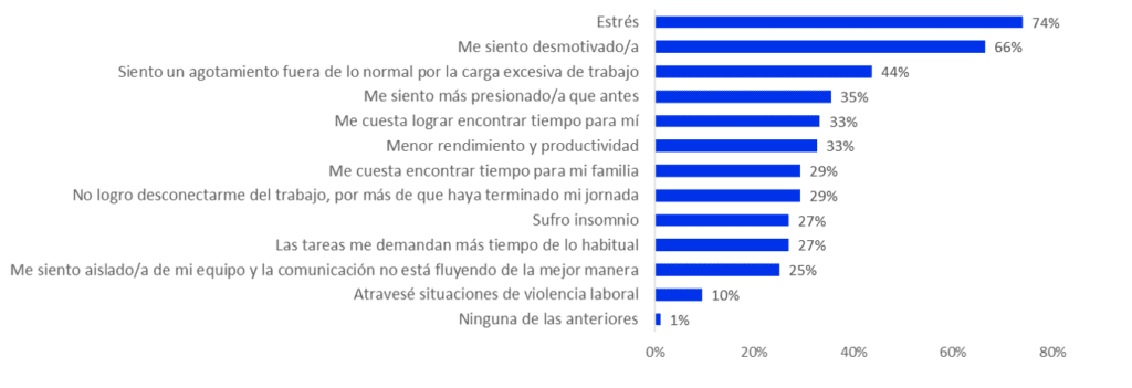 Los talentos atravesaron diferentes situaciones negativas en el ambiente laboral durante el último año. El 74% siente estrés; el 66% está desmotivado o desmotivada; el 44% experimenta un agotamiento fuera de lo normal por la carga excesiva de trabajo; un 35% está más presionado que antes; un 33% le cuesta encontrar tiempo para sí mismo, otro 33% nota que disminuyeron su rendimiento y productividad; el 29% no logra desconectarse de su empleo, y otro 29% le cuesta encontrar tiempo para su familia, un 27% sufre insomnio; otro 27% las tareas le demandan más tiempo de lo habitual; el 25% se siente aislado o aislada de su equipo y considera que la comunicación no está fluyendo de la mejor manera; un 10% atravesó situaciones de violencia laboral, y solo el 1% no ha experimentado ninguna de estas situaciones.