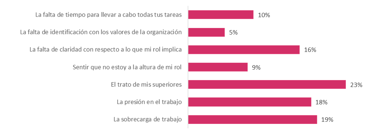 Las causas más comunes de burnout para los especialistas son: un ambiente laboral tóxico (64%); la falta de apoyo de los superiores (53%); la carga excesiva de trabajo (51%); la falta de comunicación dentro de la organización (49%); la falta de motivación laboral (47%); el exceso de presión para cumplir metas y objetivos (42%); el escaso equilibrio entre el trabajo y la vida personal (42%); la falta de reconocimiento o recompensa (42%); la desorganización en la gestión de proyectos (40%); conflictos interpersonales en el equipo de trabajo (34%); la falta de espacios de diálogo y apoyo emocional (32%); la falta de control sobre las tareas (32%); los cambios constantes en las responsabilidades laborales (30%); falta de posibilidad de desarrollo profesional o crecimiento (28%); y la inestabilidad laboral (28%).
