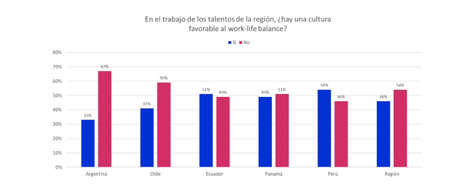 En comparación con los otros países de la región, Ecuador y Perú al igual que Panamá la mayoría de los talentos consideran que existe una tendencia real por parte de las empresas para promover el work-life balance, en un 48%, 42% y 37% respectivamente. Mientras que el 41% de los chilenos coincide con los argentinos 57% y cree que promover este equilibrio es algo discursivo que no suele materializarse en medidas reales por parte de las empresas.