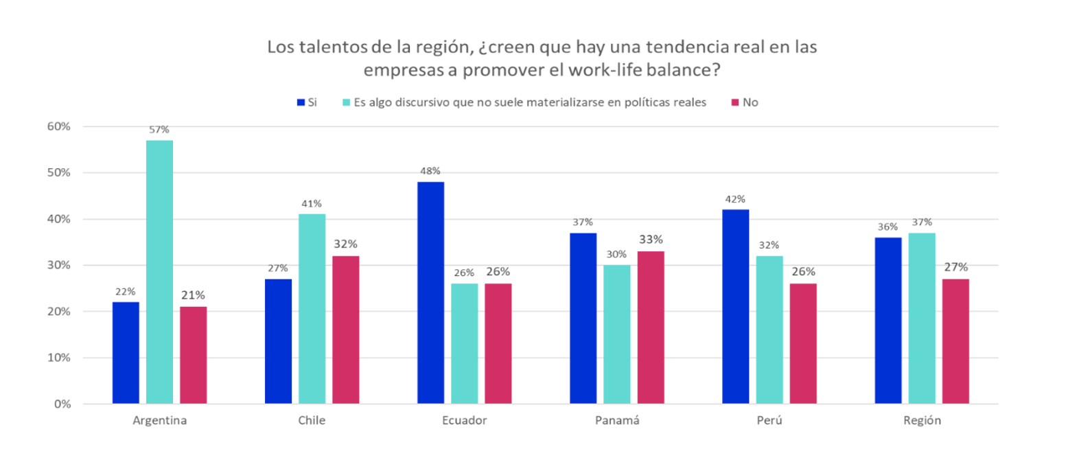 En comparación con los otros países de la región, Ecuador y Perú al igual que Panamá la mayoría de los talentos consideran que existe una tendencia real por parte de las empresas para promover el work-life balance, en un 48%, 42% y 37% respectivamente. Mientras que el 41% de los chilenos coincide con los argentinos 57% y cree que promover este equilibrio es algo discursivo que no suele materializarse en medidas reales por parte de las empresas.
