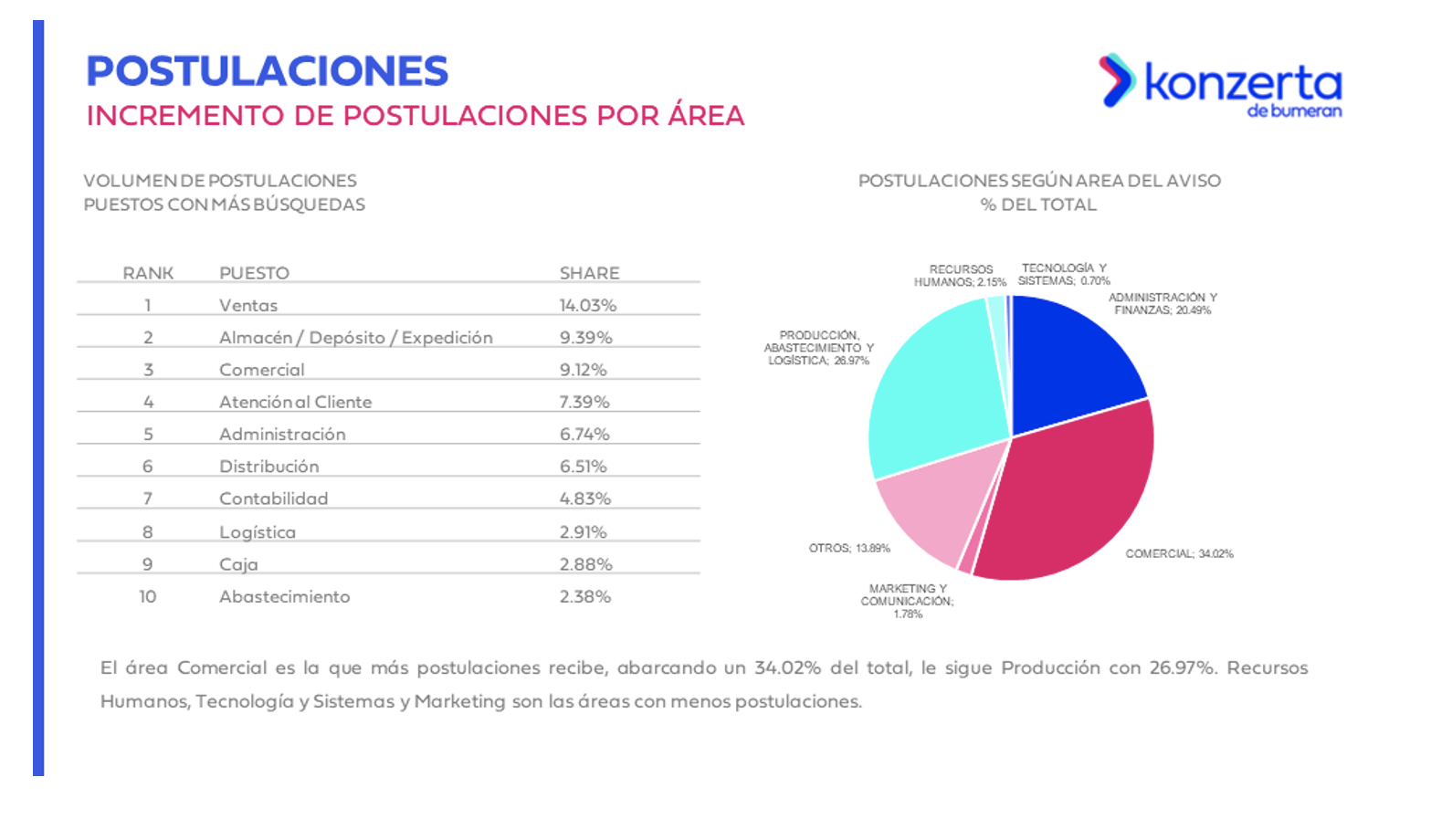 En cuanto a las postulaciones, el área de Comercial es la que más postulaciones recibió con un 34,02% del total, seguido de Producción con 26,97%. Marketing (1,78%) y Recursos Humanos (2,15%), se mantienen como las áreas con menos postulaciones durante el mes de julio.