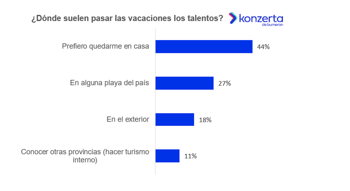 El 44% de los talentos prefiere quedarse en su casa durante el periodo vacacional; el 27% indica que aprovecha este periodo para pasarlo en alguna playa del país; el 18% menciona que suele pasar sus vacaciones en el extranjero; y el 11% dice que las aprovecha para hacer turismo interno y conocer otras provincias.