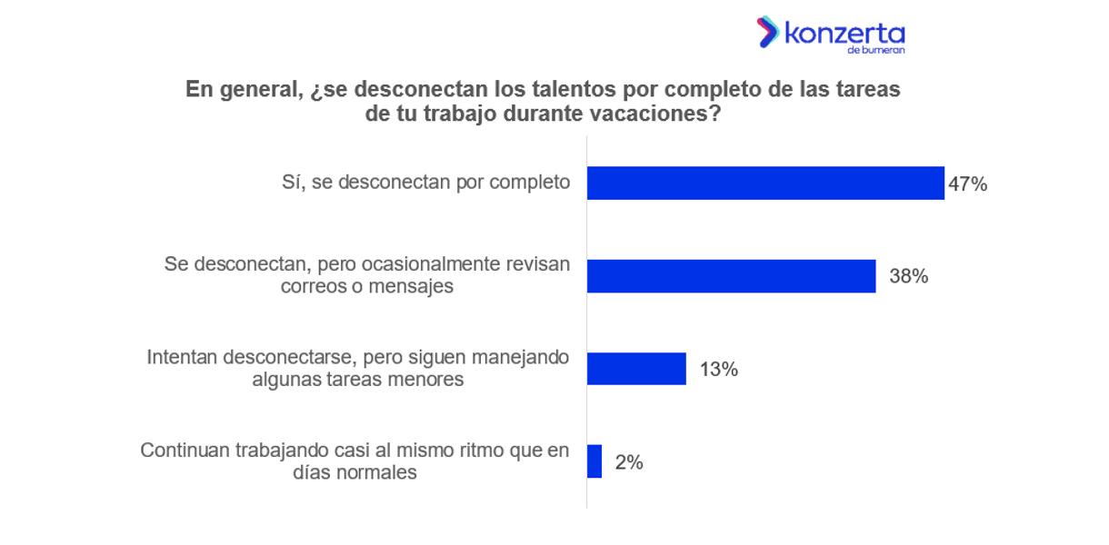 El 53% de los talentos asegura que no puede desconectarse de las tareas laborales durante sus vacaciones. De ellos, el 38% revisa ocasionalmente mensajes o correos de trabajo; el 13% dice que sigue gestionando algunas tareas menores; y el 2% continúa trabajando casi al mismo ritmo que en los días laborales. En cambio, el 47% logra desconectarse por completo, 2 puntos porcentuales más que en 2024.