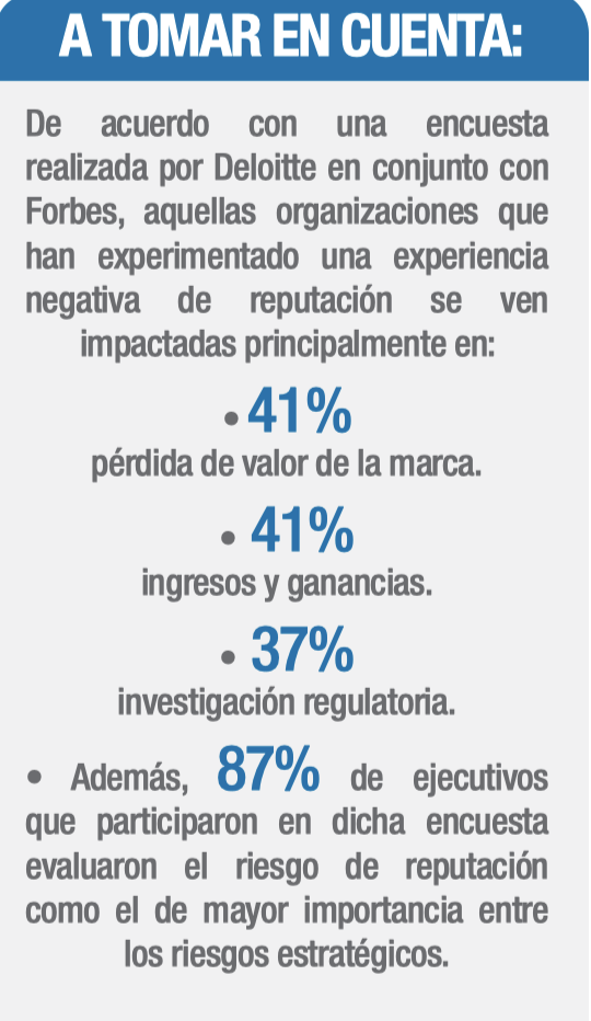 René Nájera, socio de Risk Advisory de Deloitte México, explica: “La reputación es sinónimo de confianza. Se enfoca en la credibilidad y en el respeto que una organización genera entre sus partes interesadas. La fortaleza de la reputación de una compañía depende de qué tan bien construye y mantiene la confianza entre sus partes de interés”.