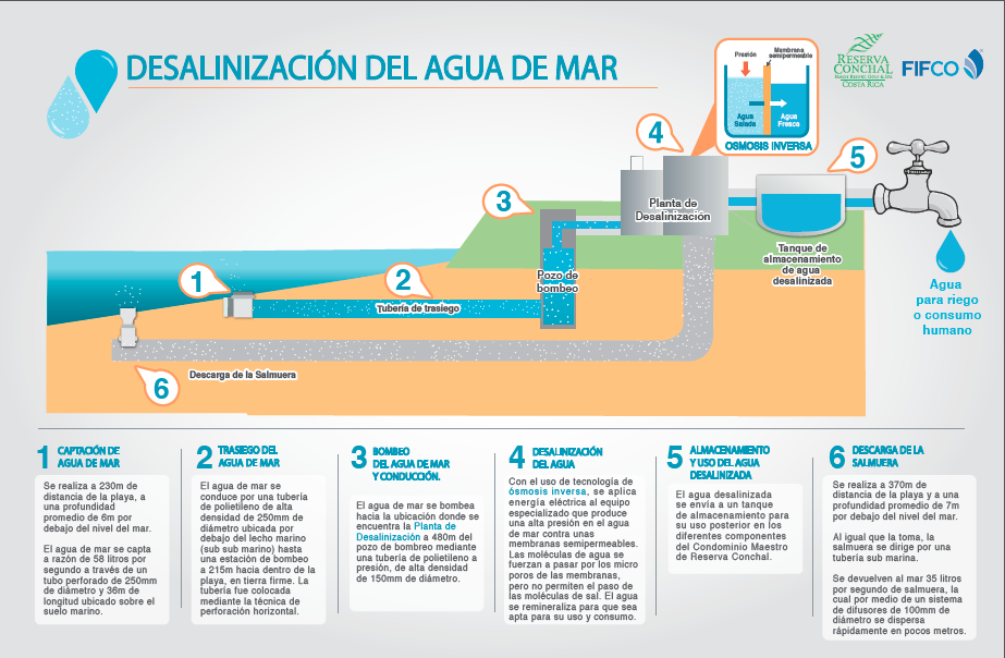 Primera planta de desalinización del país: Reserva Conchal presentó la infraestructura y cómo funcionará la primera planta de desalinización de agua de mar en Costa Rica. De la mano con la última tecnología, la empresa inició en el 2014 el proceso de diseño y construcción de dicha planta, la cual entrará en funcionamiento en las próximas semanas. Una vez instalados los cuatro módulos que prevé su diseño, contará con una capacidad de generar 23 litros por segundo de agua potable. La planta abastecerá agua para consumo humano y mantenimiento de áreas verdes dentro del complejo turístico Reserva Conchal, que permitirán el desarrollo futuro de dicho complejo. Captura de pantalla 2016-07-22 a las 14.39.37