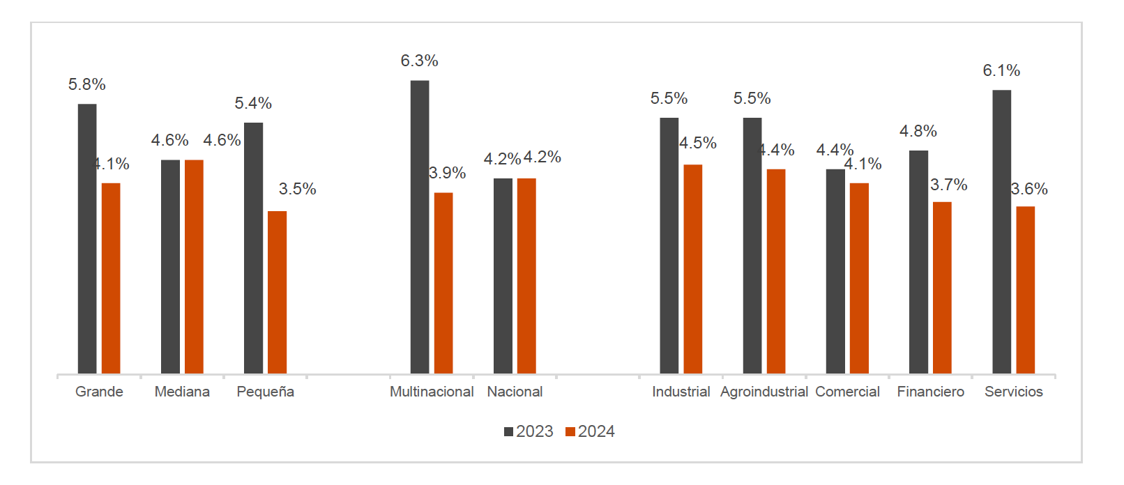 Además, el estudio reveló que las empresas del sector servicios, agroindustrial y comercial fueron las que en promedio otorgaron los mayores incrementos salariales. Los menores incrementos durante el primer semestre 2024 fueron otorgados en las empresas del sector financiero.