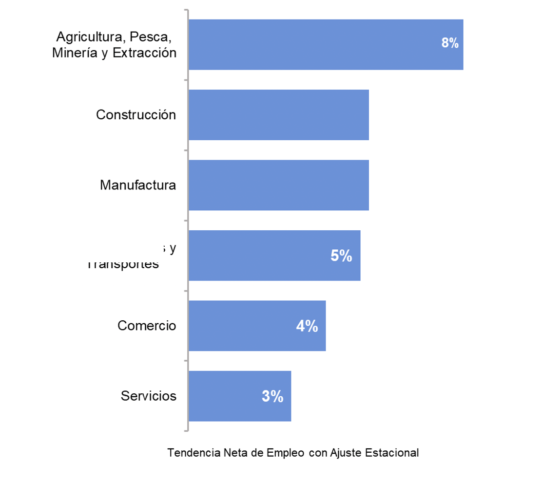 El mercado laboral más fuerte se anticipa en el sector de Agricultura, Pesca, Minería y Extracción con una expectativa de +8%, seguido de los sectores de Construcción y Manufactura con +7% cada uno. Mientras que, Servicios reporta una expectativa de +3%, se mantiene relativamente estable en comparación trimestral, pero disminuye 6 puntos porcentuales cuando se compara con el mismo periodo del año anterior.