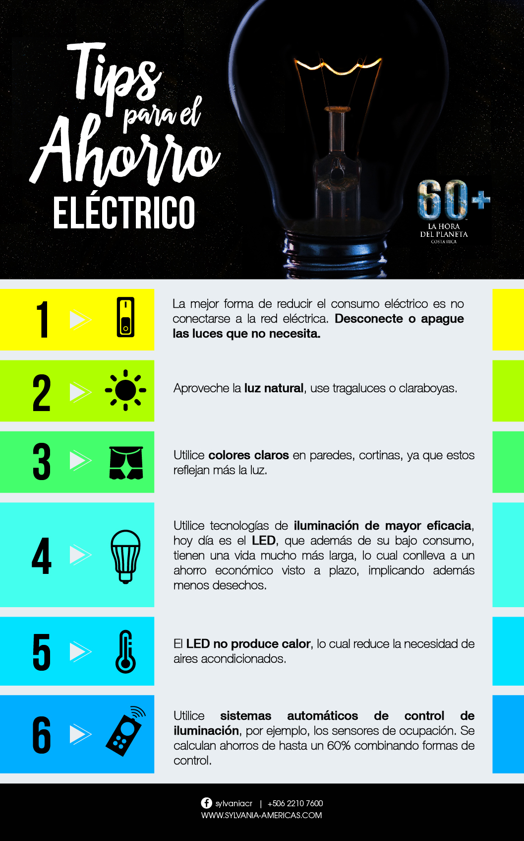 Por ejemplo, un bombillo LED de un flujo luminoso muy alto, superior a los 1000 lm, ahorra 13.35 kWh al mes. Tomando como ejemplo un hogar donde se sustituyan 9 bombillos y con base en 5 horas diarias de uso, tendríamos un ahorro de 600 KWh. Esto solamente con la sustitución de bombillos tradicionales por la nueva tecnología LED.Infográfico Tips para el Ahorro-01