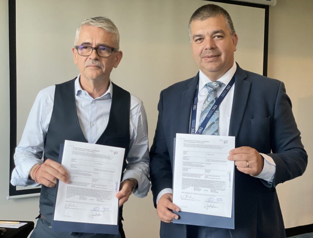 GIZ y el TEC, firmaron la entrega de donación del software. A la derecha, Federico Corrales, asesor de la Cooperación Alemana de GIZ; y a la izquierda, José Luis León, Vicerrector de Investigación y Extensión del TEC.