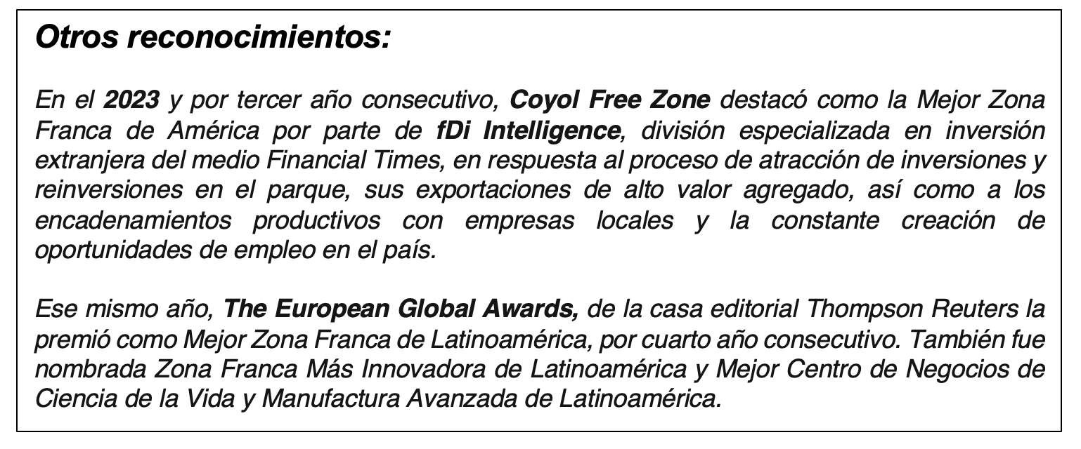 “En Coyol Free Zone nos sentimos sumamente honrados con este reconocimiento, el cual nos motiva a seguir comprometidos con el desarrollo de negocios más sostenibles, que engloben y promuevan actividades que impacten de forma positiva aspectos ambientales, sociales y económicos en las comunidades donde operamos”, dijo Carlos Wong, Director General de Coyol Free Zone.